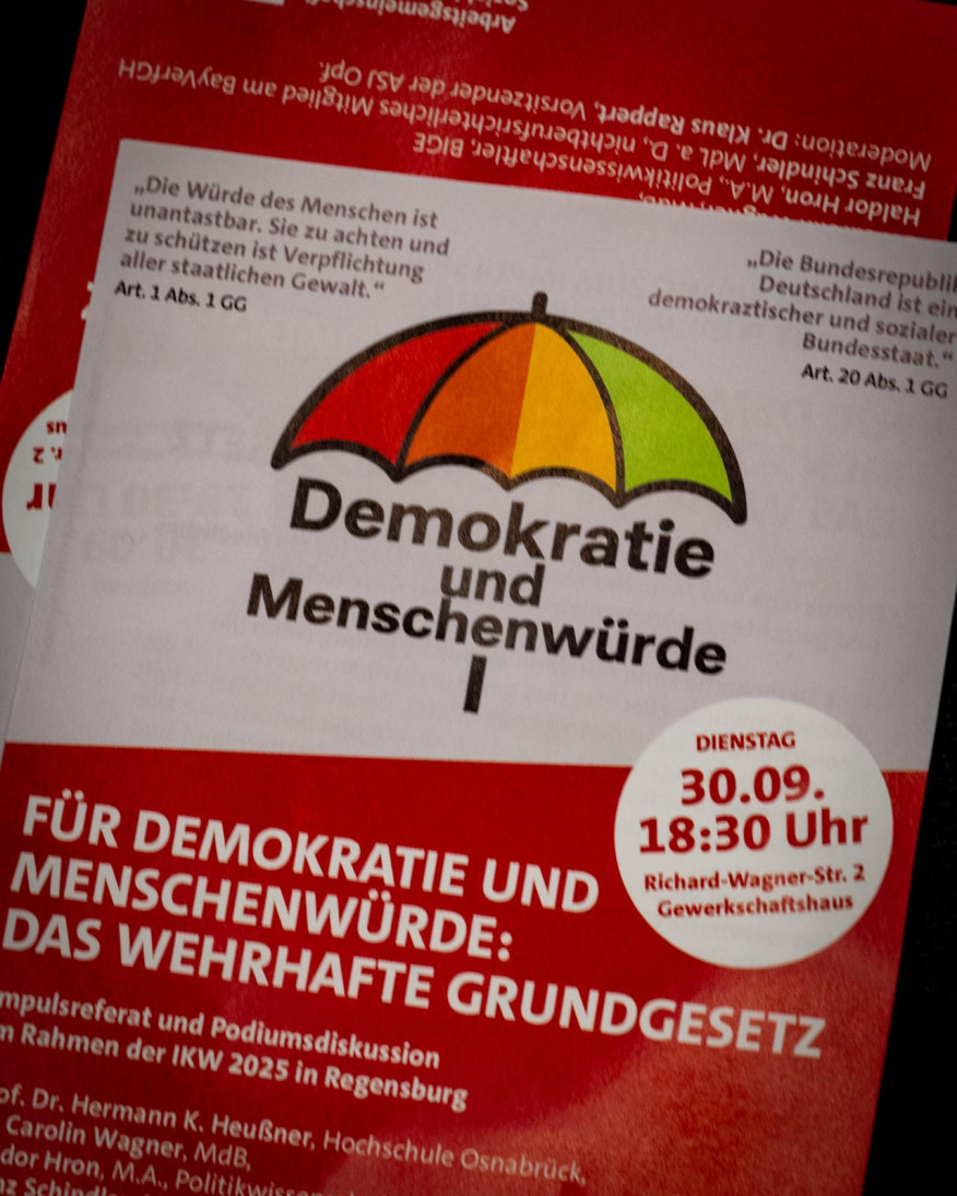 Am 30. September 2025 lud die Arbeitsgemeinschaft Sozialdemokratischer Jurist*innen (ASJ) Oberpfalz zu einer Veranstaltung im Rahmen der Interkulturellen Wochen in das Gewerkschaftshaus Regensburg ein. Gast und Hauptredner des Abends war der renommierte Staatsrechtswissenschaftler Prof. Dr. Hermann K. Heußner von der Hochschule Osnabrück. Unter dem Titel „Für Demokratie und Menschenwürde – Das wehrhafte Grundgesetz“ beleuchtete er eindrucksvoll die Bedeutung des Grundgesetzes als Schutzschild gegen die Feinde der Demokratie.