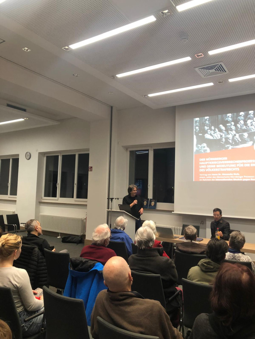 Als Referent konnte Dr. Alexander Korb gewonnen werden, ein ausgewiesener Experte für Rechts- und Ideengeschichte. In seinem Vortrag gelang es ihm, die Nürnberger Prozesse sowohl in ihren historischen Kontext einzuordnen als auch ihre grundlegende Bedeutung für die Herausbildung des modernen Völkerstrafrechts herauszuarbeiten. Dabei spannte er den Bogen von der erstmaligen individuellen strafrechtlichen Verantwortlichkeit für staatliches Unrecht bis hin zu den strukturellen Grundlagen heutiger internationaler Strafgerichtsbarkeit.